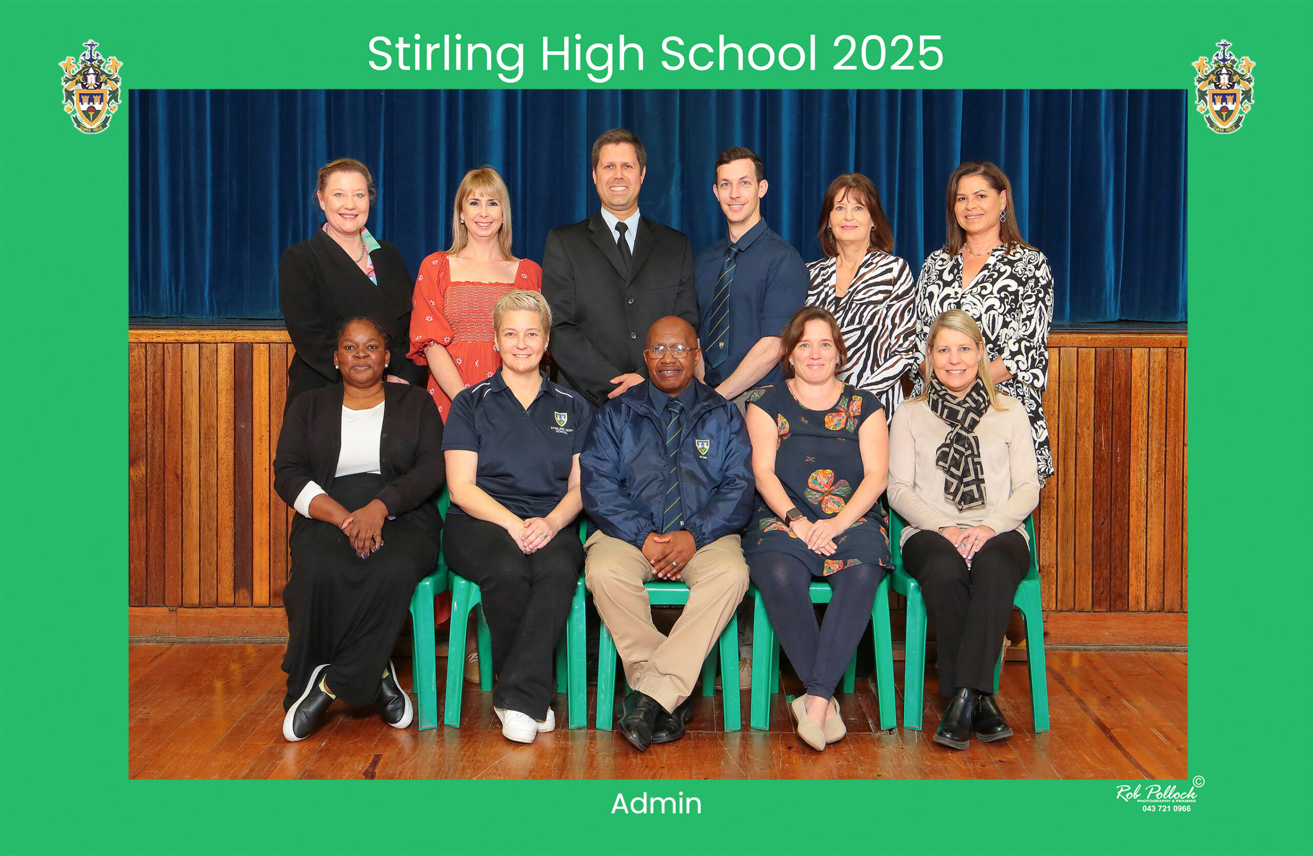 - Green and blue background – Representing Stirling Primary and Commercial High, the school’s predecessors.